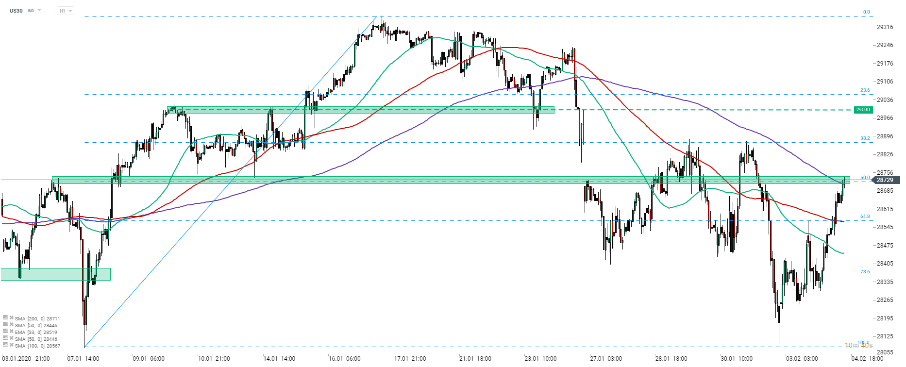 Major Wall Street indices managed to halt declines and are recovering this week. Dow Jones (US30) is set to launch today’s cash session almost 1.2% higher. The index is testing mix of key resistances - 200-hour moving average (purple line), 50% Fibo level of the upward move started on January 8 as well as the zone marked by previous price reactions. Clearing this hurdle would pave the way towards the next resistance in line - 38.2% Fibo level at 28875 pts. Source: xStation5