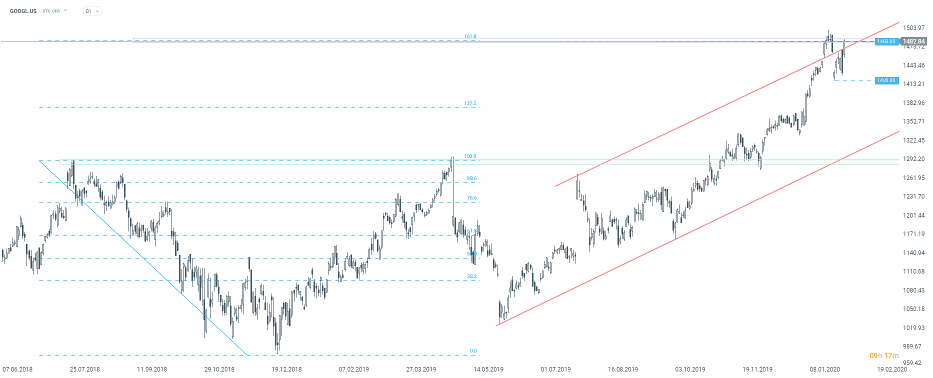 Alphabet (GOOGL.US) is testing the price zone ranging near the all-time high ($1485 area). A point to note is that 161.8% exterior retracement of the late-2018 downward move props up this area. Having said that it could be the major resistance to watch over the coming days. However, the stock is set to open around 3% lower today. Source: xStation5