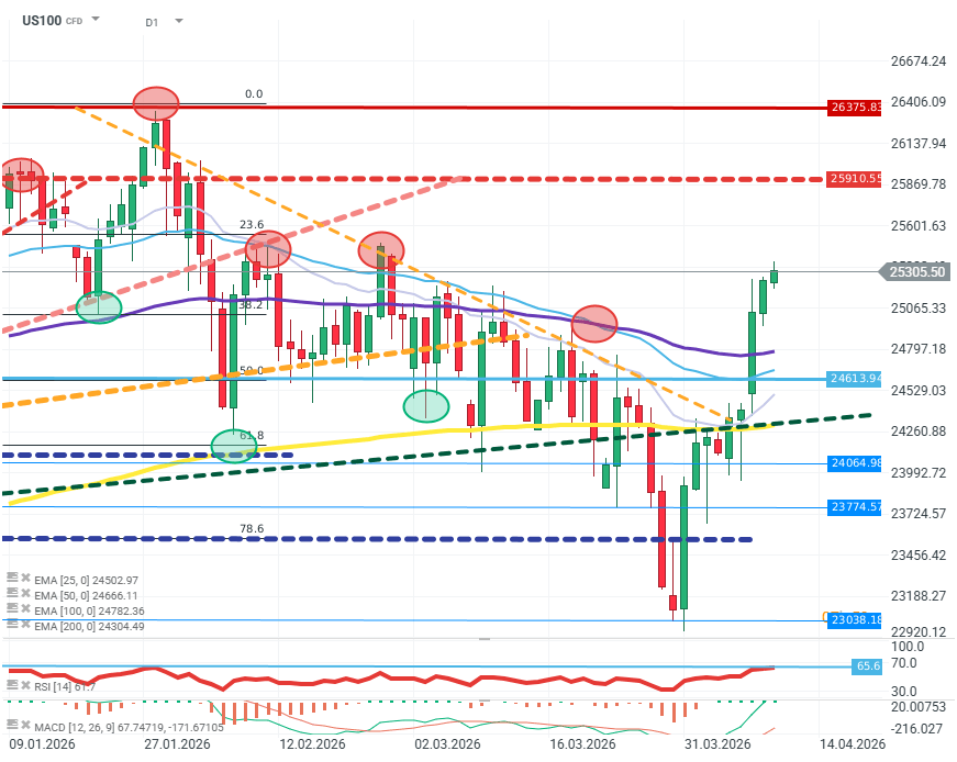 The final session of a turbulent week on Wall Street begins with a sense of calm and cautious optimism. Since the local low on March 31, the major US indices have already recovered about 9%, returning to levels seen before the start of the war in Iran, despite the lack of solid prospects for peace in the region. Today, most futures contracts on the main indices are hovering around opening levels, limiting gains to about 0.2%.