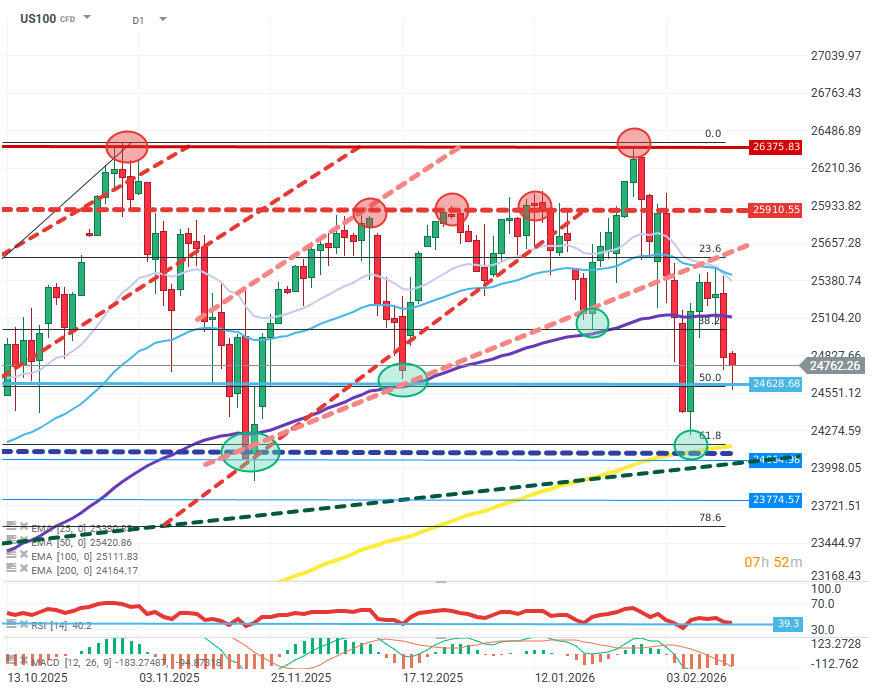Buyers failed to reclaim levels above the 23.6% Fibonacci level, signaling weak demand and a gradual loss of momentum. For sellers, the main target is resistance at the 61.8% Fibonacci level, a break of which could open the way for a deeper correction. Before that happens, the 50% Fibonacci level must be overcome. Some support for price comes from the RSI, which has fallen close to overbought territory. Source: xStation5