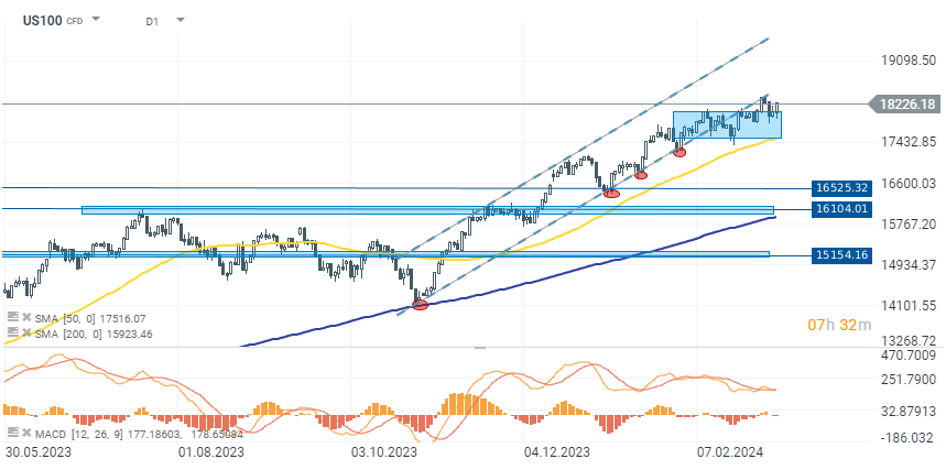 The technology company index gains 1.00% at the start of the session and is approaching historical highs around 18330 points. The index is attempting to break out of a short-term consolidation upwards. However, on the MACD indicator, a divergence is observed, suggesting a weakening upward momentum.
