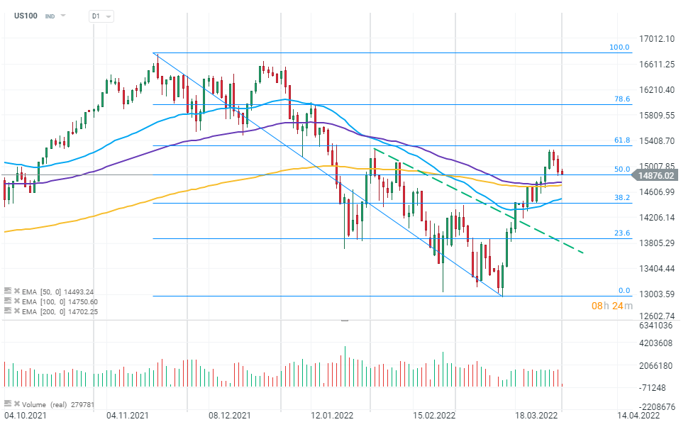 Today's early trading session on Wall Street brought small declines in the US100 index. Currently, the benchmark is descending towards the important support zones determined by the confluence of 100- and 200-day exponential moving averages (violet and gold lines, respectively) and the 50% Fibo retracement. The nearest target for the demand side may be the area of the 61.8% retracement, which stopped the last upward wave. Source: xStation 5