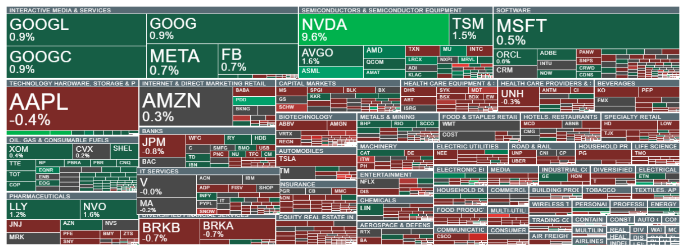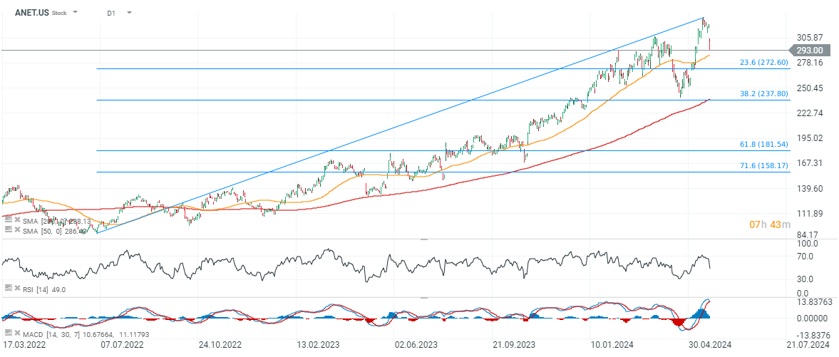 - Arista Networks (ANET.US) loses more than 4% after Nvidia comments on Spectrum X debut and business expansion in networking sector. Most semiconductor manufacturers shares, including Taiwan Semiconductor (TSM.US), AMD (AMD.US) and ASML (ASML.NL), are rising today