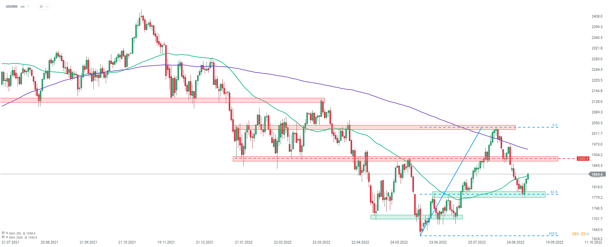 Small-cap Russell 2000 (US2000) extends recovery move launched after a test of the support zone marked with 61.8% retracement of recent upward impulse. Index is making a break above the 50-session moving average today, that was a swing level in the past. Breaking above this moving average may pave the way for a test of the next resistance in line - 1,920 pts price zone. This area is marked with previous price reactions. Note that a key 200-session moving average (purple line) can be found slightly above it. Source: xStation5