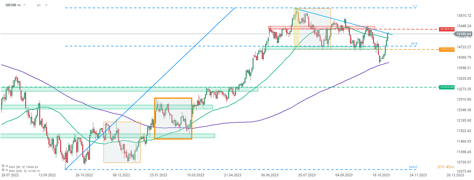 A break below the lower limit of the descending triangle pattern on Nasdaq-100 futures chart (US100) turned out to be a false breakout and the index climbed back above 14,650 pts area. Strong upward move pushed the price back to the bearish trendline which is being tested at press time. A break above would brighten the outlook for the buyers but a break above the 15,350 pts resistance zone would be needed to confirm it.