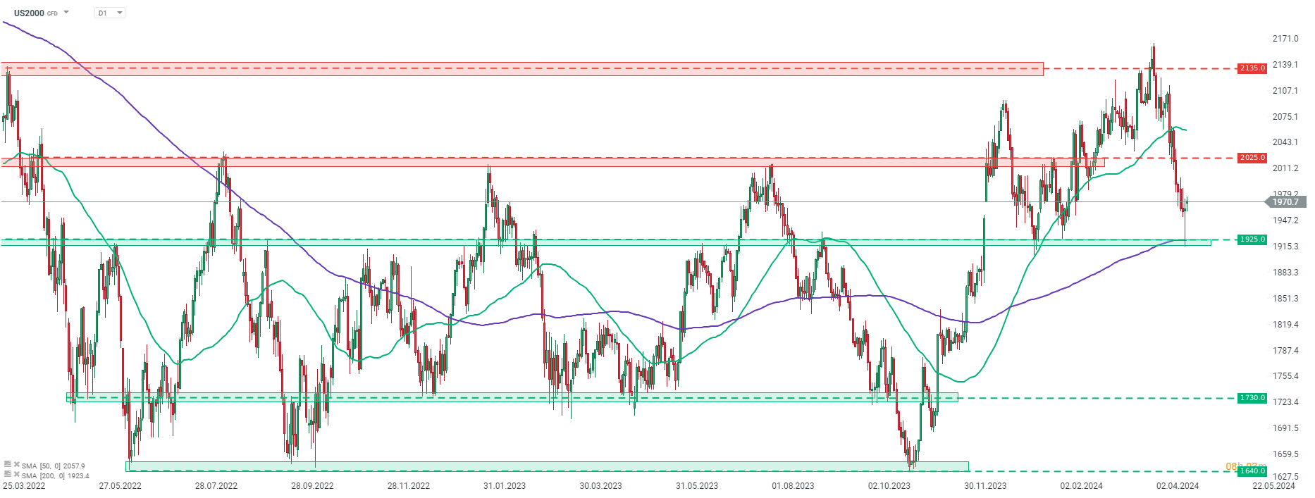 Small-cap Russell 2000 (US2000) is the best performing Wall Street index at the beginning of a new week. Taking a look at US2000 chart at D1 interval, we can see that the index plunged and tested 1,925 pts support zone on Friday, marked with 200-session moving average (purple line). However, bulls managed to defend the area and index recovered all of the losses. Rebound continues today with the index gaining around 0.5% at press time. Should upbeat moods prevail, the next potential target for buyers could be 2,025 pts resistance zone.