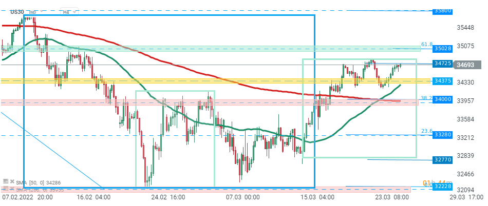 US30 has been moving higher in recent days, however buyers struggle to break above resistance at 34725 which is marked with the upper limit of the 1:1 structure. As long as the price is below this level, another downward move may be launched. Source: xStation5