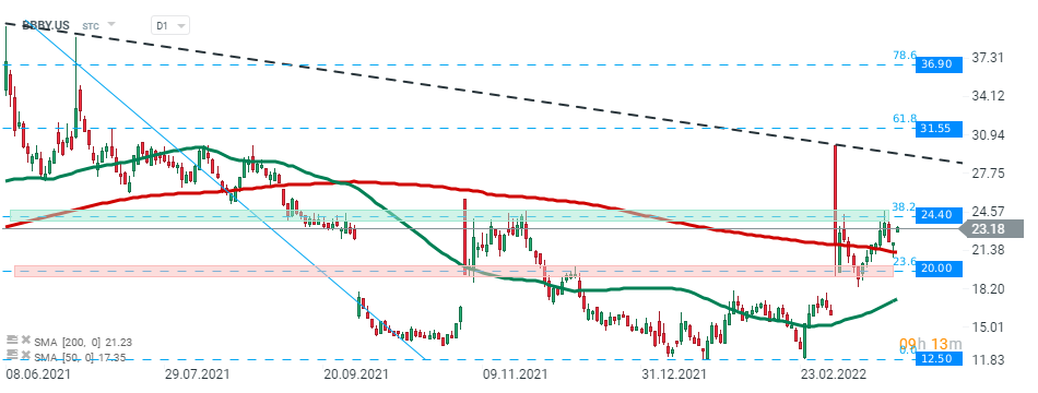 Bed Bath & Beyond (BBBY.US) stock launched today's session higher and is heading towards resistance at $24.40 which is marked with 38.2% Fibonacci retracement of the last upward wave. Should break higher occur, upward move may accelerate towards long-term downward trendline. However if sellers manage to regain control, then support at $20.00 may be at risk. Source: xStation5