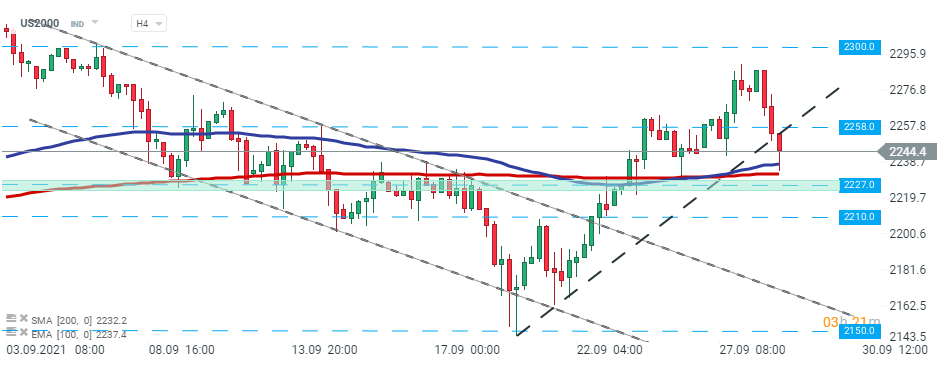 US2000 fell sharply during today’s session. Index broke below the upward trendline and is currently approaching strong support at 2227 pts which is additionally strengthened by EMA 100 (purple line) and 200 SMA (red line). Should break lower occur, then downward move may be extended to the 2210 pts handle or even support at 2150 pts. On the other hand, if buyers manage to halt decline, then another upward impulse towards resistance at 2300 pts may be launched. Source: xStation5