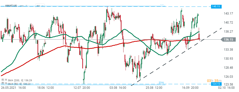 Applied Materials (AMAT.US) stock launched today’s session lower and is currently testing an upward trendline which coincides with the 200 SMA ( redline). Should break lower occur, then downward move may accelerate towards support at $124.10 which coincides with 23.6% Fibonacci retracement of the upward wave launched back in September 2020. On the other hand, if buyers manage to regain control, then another upward impulse toward all-time high at $145.15 may be launched. Source: xStation5