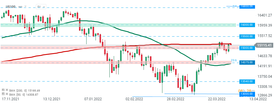US100 rebounded sharply since mid-March however index is struggling to break above major resistance at 15000 pts which coincides with 200 SMA (red line). If buyers manage to push higher, then upward move may accelerate towards next resistance at 15500 pts which is marked with previous price reactions. On the other hand, should sellers regain control, then support at 14375 pts may be at risk. Source: xStation5