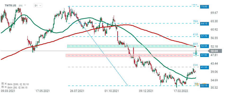 Twitter (TWTR.US) stock extended yesterday's gains and is currently testing major resistance at $52.55 which coincides with 50.0% Fibonacci retracement of the last downward wave and 200 SMA (red line). Should break higher occur, upward move may accelerate towards $57.70 which is marked with previous price reactions and 61.8% retracement. Source: xStation5