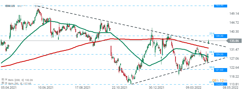 IBM (IBM.US) stock launched today's session with a bullish price gap and is currently testing the upper limit of the triangle formation. If current sentiment prevails, upward move may accelerate towards local resistance at $ 138.30 which coincides with 23.6% Fibonacci retracement of the upward wave launched in March 2020. On the other hand, if sellers manage to regain control, nearest support to watch lies at $129.20. Source: xStation5