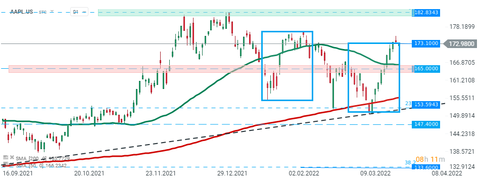 Apple (AAPL.US) stock rose sharply last week and buyers managed to break above the upper limit of the 1:1 structure at $173.10. If buyers manage to uphold current momentum, upward move may accelerate towards all-time high at $182.83. Source: xStation5