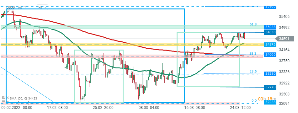 US30 pulled back after buyers failed to break above local resistance at 34830 pts, which is marked with an upper limit of the 1:1 structure. If current sentiment prevails, downward move may accelerate towards 34375 pts, which coincides with 50 SMA (green line). Source: xStation5