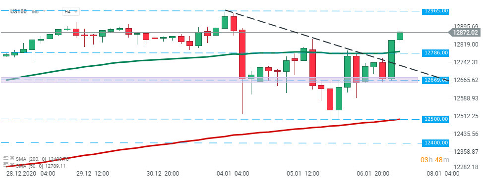 US100 was trading under slight pressure recently. However, today index bounced off the local support at 12,669 pts and broke above the downward trendline and 12,786 pts level. If the current sentiment prevails, the upward move may accelerate towards all-time high at 12,965 pts. On the other hand, breaking below the aforementioned support at 12,669 pts may trigger a bigger downward move. Source: xStation5