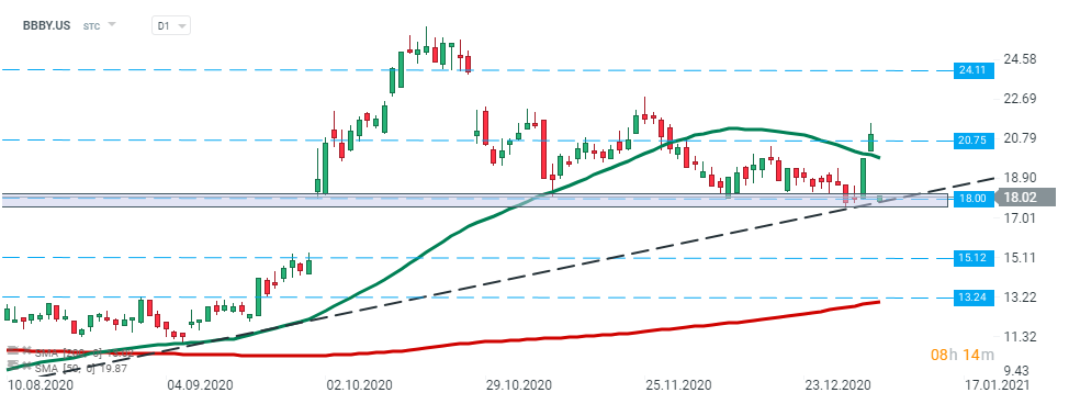 Bed Bath & Beyond (BBBY.US) stock launched today’s session with a major bearish price gap and is currently testing key support level at $18.00 which coincides with long-term trendline. Should a break below the trendline occur, downward move towards $15.12 may accelerate. However if buyers manage to halt declines here, then another upward impulse towards $20.75 level could be launched. Source: xStation5