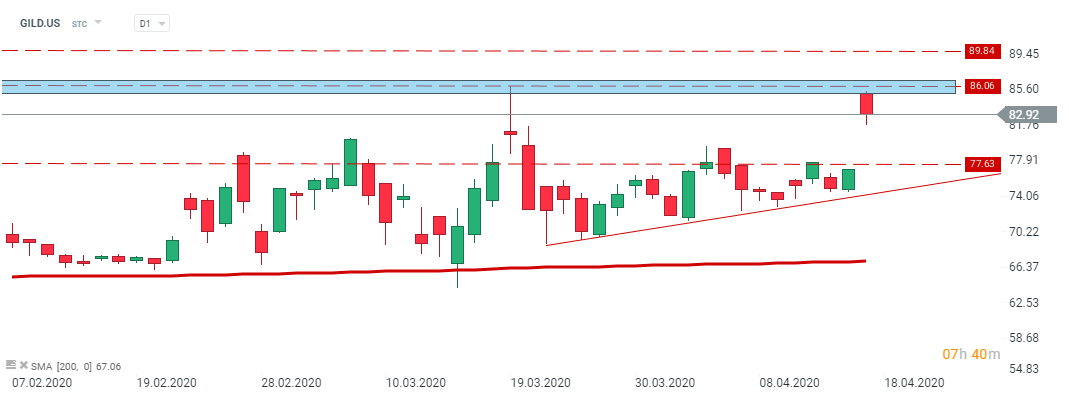 Gilead (GILD.US) launched today’s session with a bullish gap and is testing resistance at locate $86.00 per share. If the price will manage to break above this level, than further upward move may accelerate. The local support can be found at $77.63 per share. Source:xStation5.