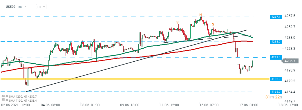 US500 fell sharply after yesterday’s FOMC decision, however buyers managed to halt declines at the local support at 4182 pts and today buyers are trying to regain control. Should a break above the local resistance at 4211 pts occur, upward move may accelerate. Until then continuation of downward correction move looks to be the base case scenario.Source: xStation5