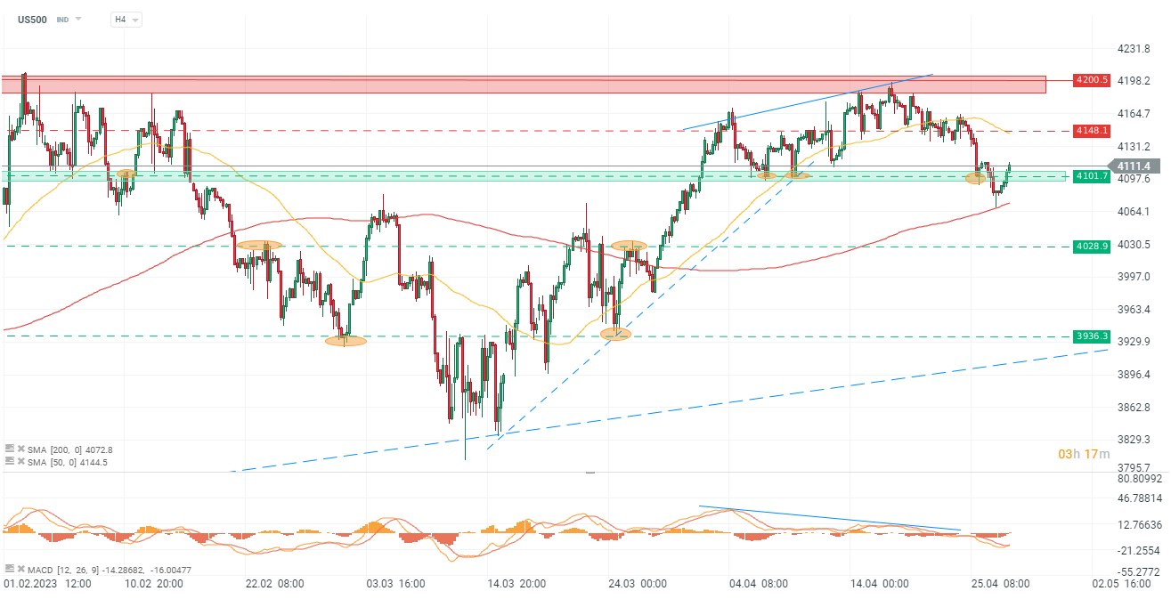 US500, the current index price is 4112 points. The price has broken through the resistance level at 4100 after rebounding from the 50 day SMA.The price has returned to the consolidation range, which suggests that there may be a lack of momentum for the index to continue to rise. Traders and investors may want to closely monitor the index to see if the price can break out of this consolidation range and establish a new upward trend, or if the price will continue to consolidate and potentially decline.