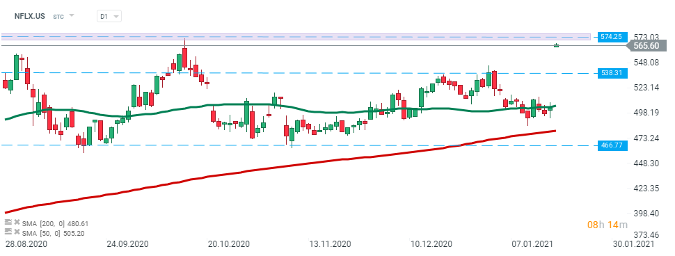 Netflix (NFLX.US) stock launched today’s session with a massive bullish price gap and is currently approaching its all-time high at $574.25. Source: xStation5