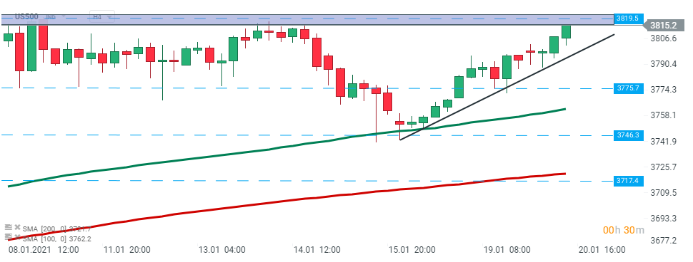US500 – index recently bounced off the upward trendline and today, one can see that the upward move is being continued after the US open. Index is approaching its all-time high at 3819.5 pts , however, if there is a riot during the inauguration, then some risk-off moves may appear. In this case, the local support lies at 3775 pts. Source: xStation5.