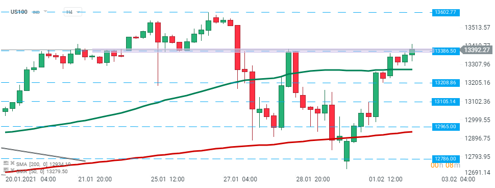 US100 managed to break above 50 SMA (green line) and is currently testing major resistance at 13 386 pts. Breaking above this hurdle, would pave the way towards all-time highs at 13,602 pts. Source: xStation5