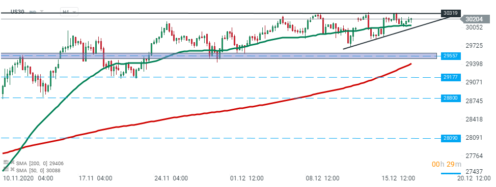 US indices launched today’s session higher on increased optimism over a coronavirus stimulus bill. Congressional leaders closed in on a near $ 900 billion package which includes $ 600- $ 700 stimulus checks and extended unemployment benefits but no aid to state and local governments and lawsuit liability protection. Meanwhile US Weekly Jobless Claims increased to 885 thousand, hitting a new three-month high, indicating that the pace of layoffs due to the latest wave of the coronavirus pandemic is accelerating. Yesterday, FED kept interest rates at near-zero levels and vowed to keep funneling cash into financial markets over the long term.
