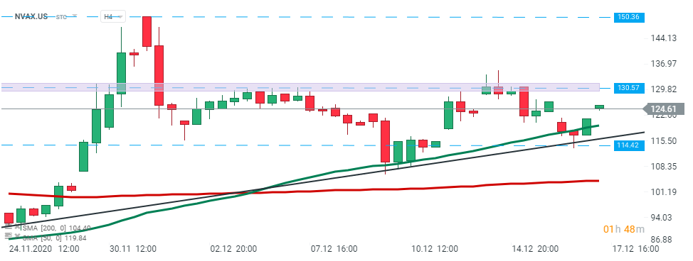 Novavax (NVAX.US) stock launched today’s session higher and is approaching local resistance at $130.57. If buyers will manage to break above it, then upward move could be extended to the $150.36 level. However should bears regain control, support at $114.42 could be at risk. Source: xStation5