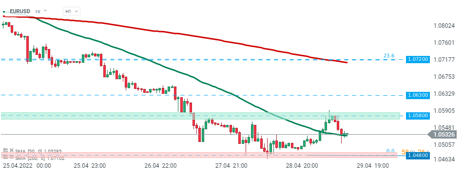 US indices launched today's session lower with the Nasdaq on pace for the worst month since March 2020 as investors digested disappointing results and more important next quarter earnings estimates from Amazon and Apple. The shares of Amazon tumbled more than 10% after reporting a surprise loss because of its investment in Rivian and issuing weak revenue guidance for Q2 2022. Also today's PCE core inflation reading showed that price pressures are still elevated which may force FED to take steeper actions. In turn prospects of faster rate hikes puts pressure on the whole tech-sector.
