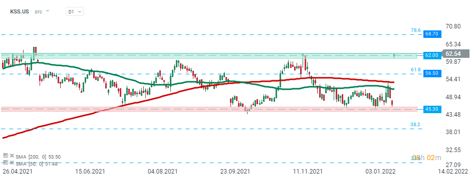Kohl’s (KSS.US) stock launched today's session with a massive bullish price gap and is currently testing the upper limit of the consolidation zone around $62.00. Should a break higher occur, an upward move may accelerate towards resistance at $68.70 which is marked with 78.6% Fibonacci retracement of the downward wave launched in October 2018. On the other hand, if sellers will regain control, then nearest support lies at $56.50 and coincides with 61.8% retracement. Source: xStation5
