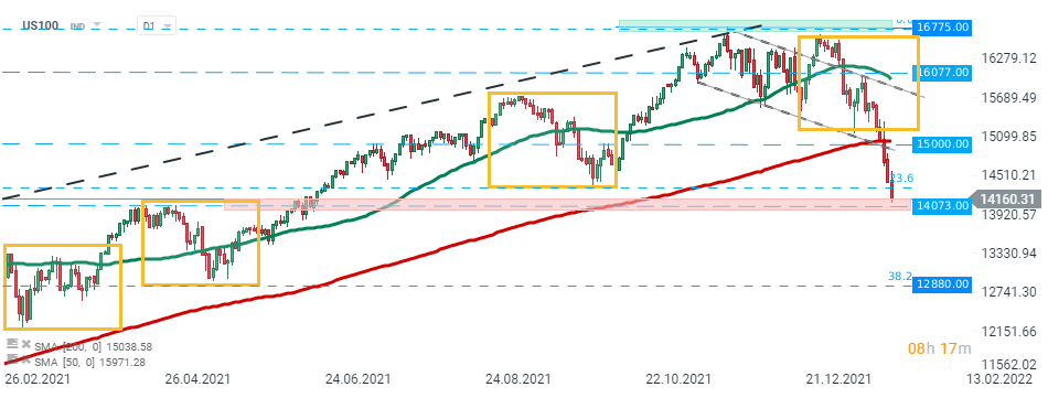 US100 deepened recent sell-off and is currently testing support at 14073 pts which is marked with previous price reaction. Should break lower occur, the next target for sellers is located at 12880 pts which coincides with 38.2% Fibonacci retracement of the upward wave launched in March 2020. Source: xStation5