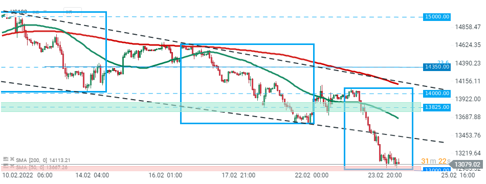 US100 fell sharply to 40-week low as Russia-Ukrainian conflict escalated. Index broke below the lower limit of the descending channel and is currently testing the lower limit of the 1:1 structure around 13000 pts. Source: xStation5