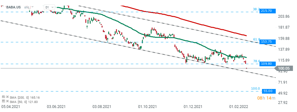 Alibaba (BABA.US) stock has been moving in a downward trend through the whole 2021 and the beginning of the current year. Escalation of geopolitical tensions and poor quarterly performance additionally weighed on market sentiment. Currently the price is approaching the lower limit of the descending channel. Should break lower occur, downward move may accelerate towards lows from August 2015 around $55.00. Source: xStation5