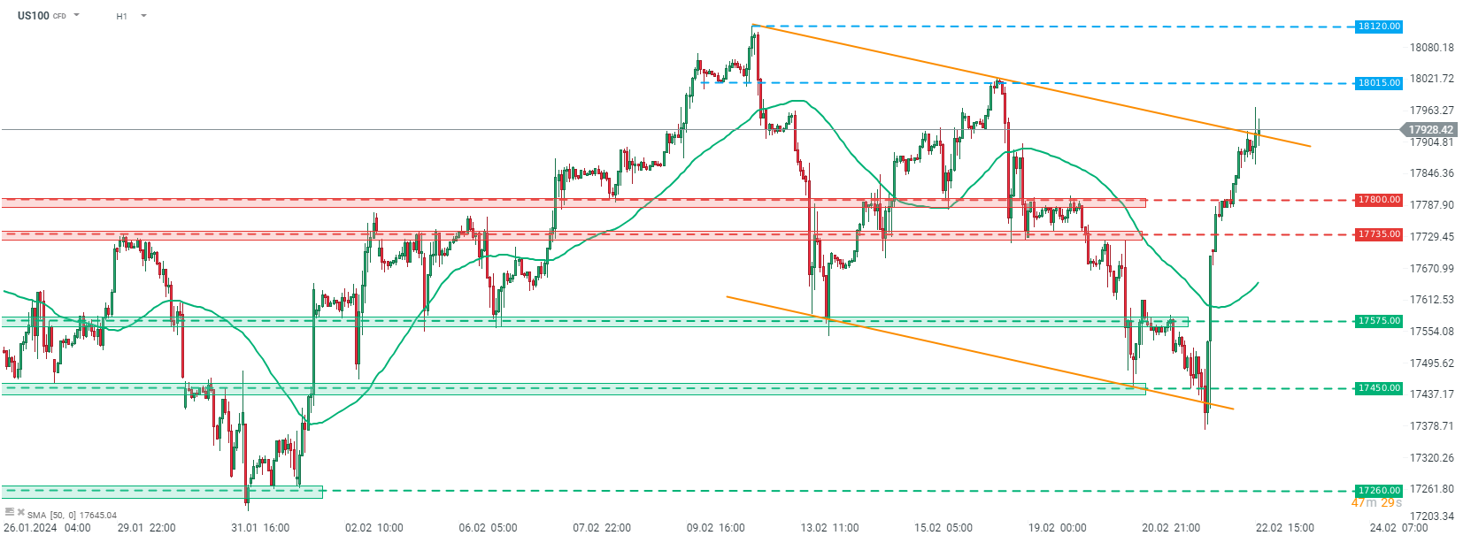 Nasdaq-100 futures (US100) are rallying, fuelled by solid results from Nvidia. Sentiment towards tech shares as well as the whole equity market is bullish today. Taking a look at the chart at H1 interval, we can see that the index bounced off the lower limit of the bearish channel and rallied to the upper limit in the 17,920 pts area. An attempt to break above this zone is being made at the start of today's trading session. The two next levels to watch are local high at 18,015 pts and record highs at 18,120 pts.