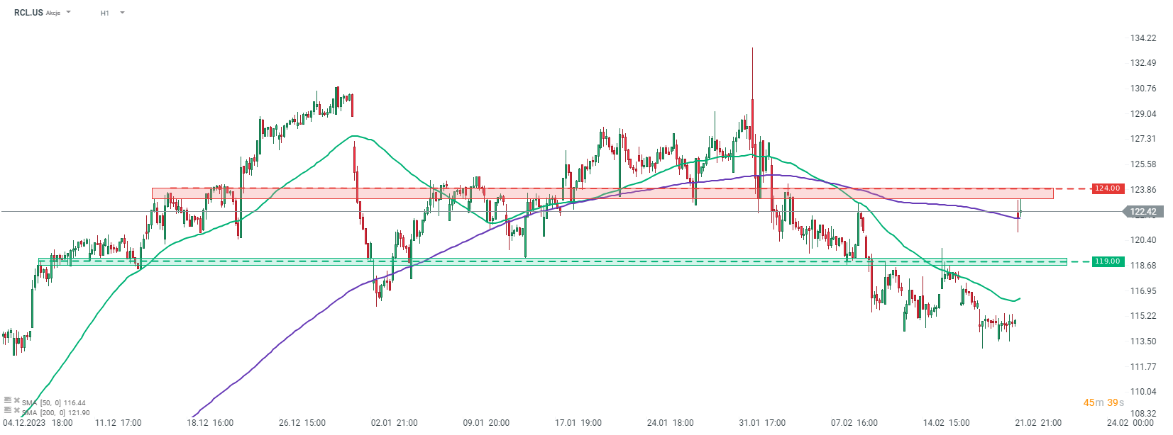 Royal Caribbean (RCL.US) is surging after boosting full-year earnings guidance. Stock launch today's trading above $119 price zone and is eyeing a test of the $124 resistance area. Source: xStation5