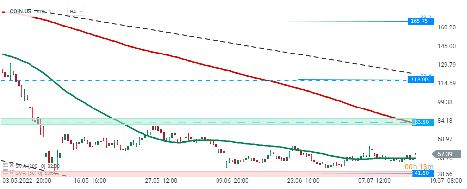 Coinbase (COIN.US) stock has been moving sideways in recent months following a sharp sell-off which started in November 2021. Buyers managed to halt declines around $41.60, which acts as major support. Stock launched today's session with a bullish price gap, however the main trend remains downward and only a decisive break above resistance at $83.50 would negate the bearish scenario. Source: xStation5