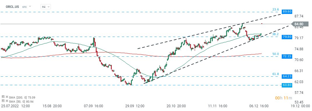 Oracle (ORCL.US) stock launched today's session sharply higher and is approaching the upper limit of the wedge formation. Should a break higher occur, an upward move may accelerate towards resistance at $89.60 which coincides with 23.6% Fibonacci retracement of the upward wave launched in March 2020. Source: xStation5