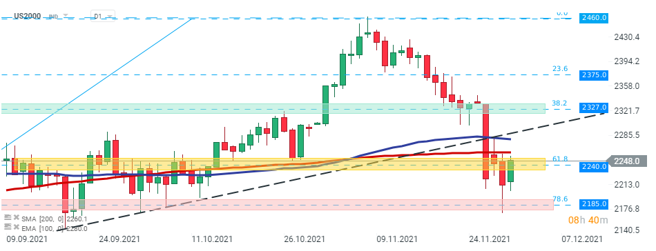 US2000 fell sharply in recent days, however sell-off lost it steam around support at 2185 pts and rebound occurred. Currently the index is testing a resistance zone around 2240 pts which coincides with 61.8% Fibonacci retracement of the upward wave launched in August 2021 and 200 SMA (red line). If buyers manage to keep the price above this level, then another upward impulse towards the earlier broken upward trendline may be launched. On the other hand, if sellers manage to regain control, then the aforementioned support at 2185 pts may be at risk. Source: xStation5