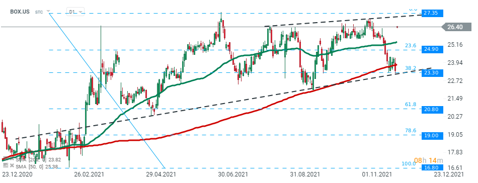 Box (BOX.US) stock fell sharply yesterday however buyers managed to halt declines at the major support zone around $23.30 which is marked with 38.2% Fibonacci retracement of the upward wave launched in February 2021 and upward trendline. Stock launched today’s session with a huge bullish price gap and if current sentiment prevails upward move may accelerate towards all-time high at $27.35. Source: xStation5
