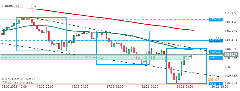 US100 fell sharply during yesterday's session however sellers failed to break below major support at 13000 pts and index rebounded sharply. Currently US100 is testing a major resistance zone around 14000 pts which coincides with the upper limit of the 1:1 structure, 50 SMA (green line) and upper limit of the descending channel. Should break higher occur, upward move may accelerate towards next resistance at 14350 pts. Source: xStation5