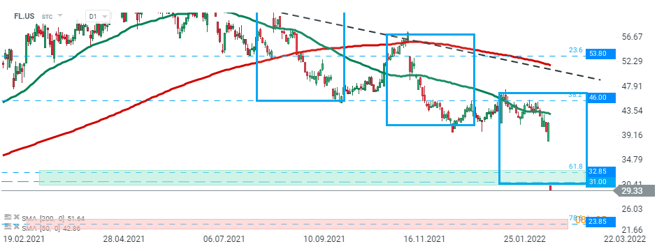 Foot Locker (FL.US) stock launched today's session with a massive bearish price gap and is currently trading below major support zone around $31.00 marked with lower limit of the 1:1 structure and 61.8% Fibonacci retracement of the upward move from March 2020. If current sentiment prevails, next support at $23.85 may be at risk. Source: xStation5