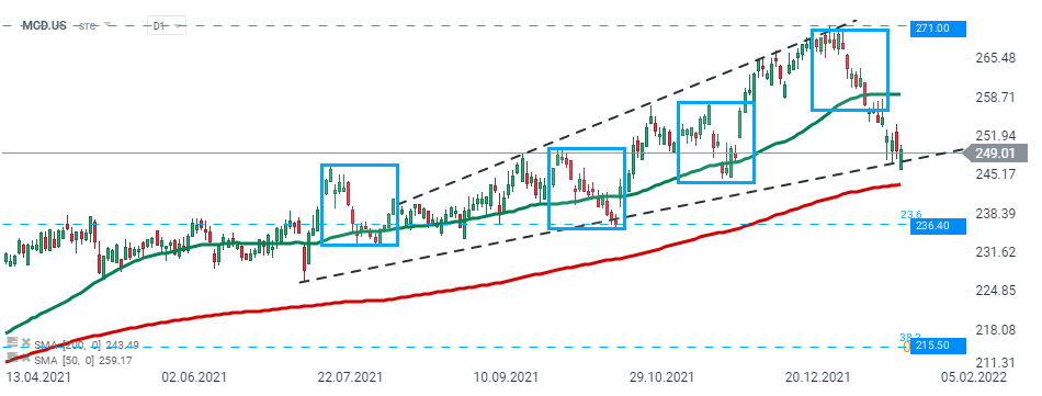 McDonald’s (MCD.US) stock has been moving downward since the beginning of January. Last week price broke below the lower limit of the 1:1 structure after which declines accelerated. Stock launched today's session with a bearish price gap, below the lower limit of the wedge formation. If current sentiment prevails, downward move may accelerate towards support at $236.40 which coincides with 23.6% Fibonacci retracement of the upward wave launched in March 2020. Source: xStation5