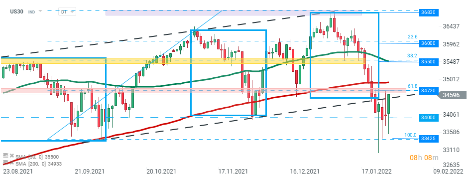 US30 managed to erase early losses and is currently approaching the major resistance zone around 34720 pts which is marked with previous price reactions, 61.8% Fibonacci retracement of the upward wave launched in October 2021 and lower limit of the ascending channel. Source: xStation5