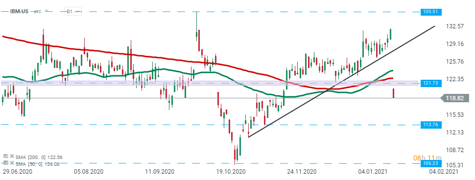 IBM (IBM.US) stock plunged more than 8% in pre-market. Currently price is trading below major support at $ 121.73 which is additionally strengthened by 50 SMA (green line) and 200 SMA (red line). If the current sentiment prevails, then the downward move could be extended to the $113.76 level. Source: xStation5