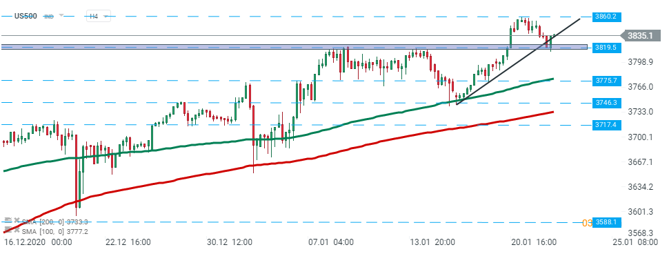 US500 – yesterday index pulled back after reaching new all-time high at 3860 pts. Today sellers managed to push the price below the upward trendline signaling that the downward correction may be on the cards. However bears must overcome support at 3819 pts to pave the way for further declines towards 3775 pts level. On the other hand, if buyers will manage to halt declines here, then another upward impulse could be launched. Source: xStation5