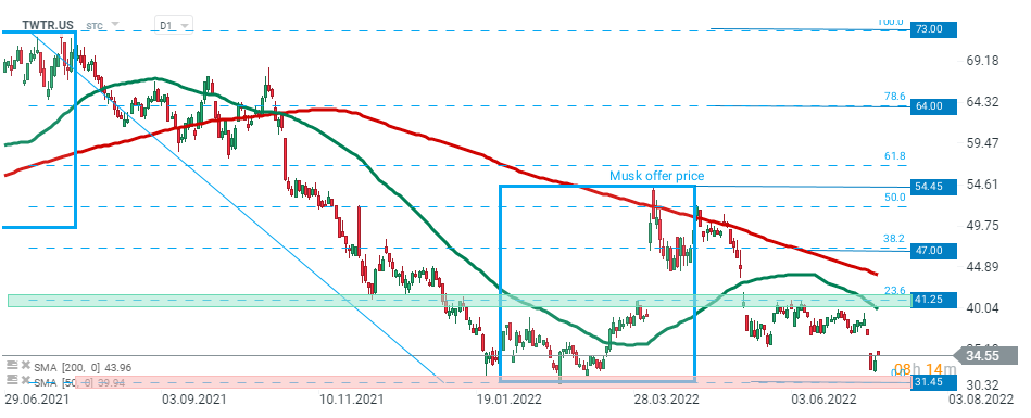 Twitter (TWTR.US) stock has been under pressure recently and if current sentiment prevails, downward move may accelerate towards February lows at $31.45. Nearest major resistance to watch can be found at $41.25 and coincides with 23.6% Fibonacci retracement of the last downward wave. Source: xStation5