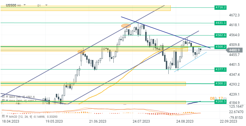 The US500 index price currently is at 4480 points, reflecting a 0.20% decline from its yesterday levels. The index has retraced from a pivotal resistance point at 4500 points and appears to be heading lower. Failure to breach this resistance could intensify selling pressure, potentially pushing the US500 price down. In this scenario, the next crucial support lies in the range of 4380-4400 points. Notably, the recent correction has created a new downward trendline, marked by two local peaks (indicated by the blue line), which could be the new index's trajectory. Traders should closely monitor developments around these key levels for potential market direction cues. Source xStation 5