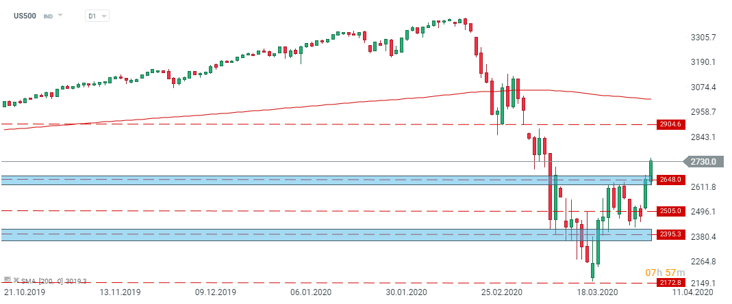 S&P500 (US500) managed to break out from the consolidation zone and the upward move is being continued after US open. Should upbeat moods prevail, resistance at 2904.6 pts may come into play. However breaking below the 2648.0 pts level will negate the bullish scenario.Source: xStation5