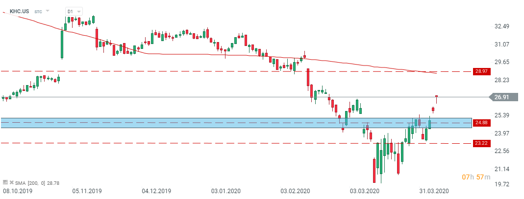 Kraft Heinz (KHC.US) – price broke above important resistance level at$24.88 per share and is heading towards next major level at $28.97 per share, which is additionally strengthen by 200 MA (redline). Source: xStation5.